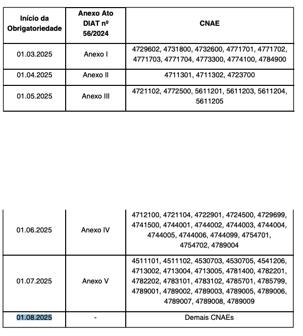 Conforme o referido ato, os estabelecimentos usuários de Equipamento Emissor de Cupom Fiscal (ECF) e do Programa Aplicativo Fiscal (PAF-ECF), que já estejam inscritos no CCICMS-SC em 20.09.2024, ficam obrigados à emissão de Nota Fiscal de Consumidor Eletrônica (NFC-e), em substituição ao cupom fiscal emitido por ECF, nos seguintes prazos: